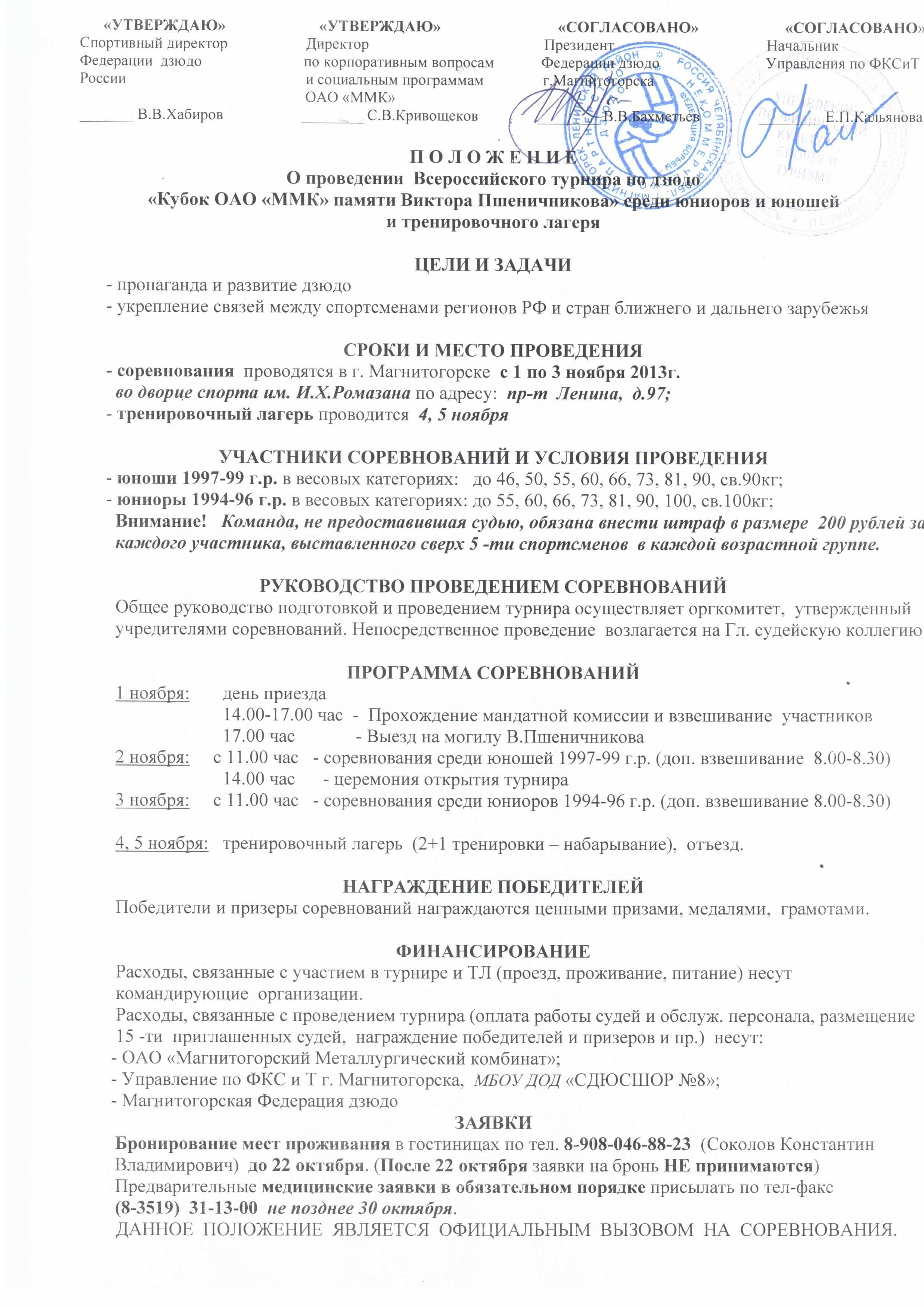 Положение о проведении Всероссийского турнира по дзюдо "Кубок ОАО "ММК" памяти Виктора Пшеничникова среди юниоров и юношей, а также тренировочного лагеря, 1-5 ноября 2013 года, Магнитогорск, Челябинская область