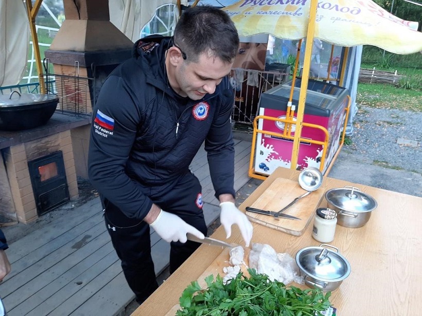 После забега все были приглашены на участок аттракционов, где их ждал «Ужин с чемпионом» — Кирилл Денисов приготовил для гостей спортивного праздника грузинский суп чихиртма.