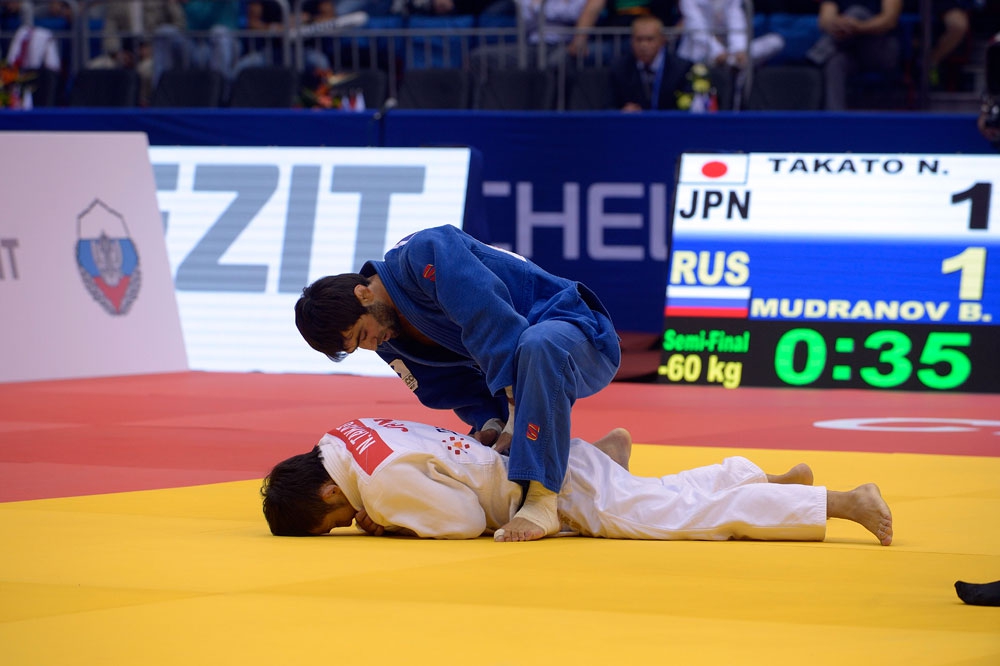 Двукратный чемпион Европы в финальном поединке весовой категории до 60 кг у мужчин Беслан Мудранов принес первую медаль сборной России на ЧМ-2014 по дзюдо. Она серебряного достоинства – в финальном поединке спортсмен уступил Болдбаатару Ганбату из Монголии.