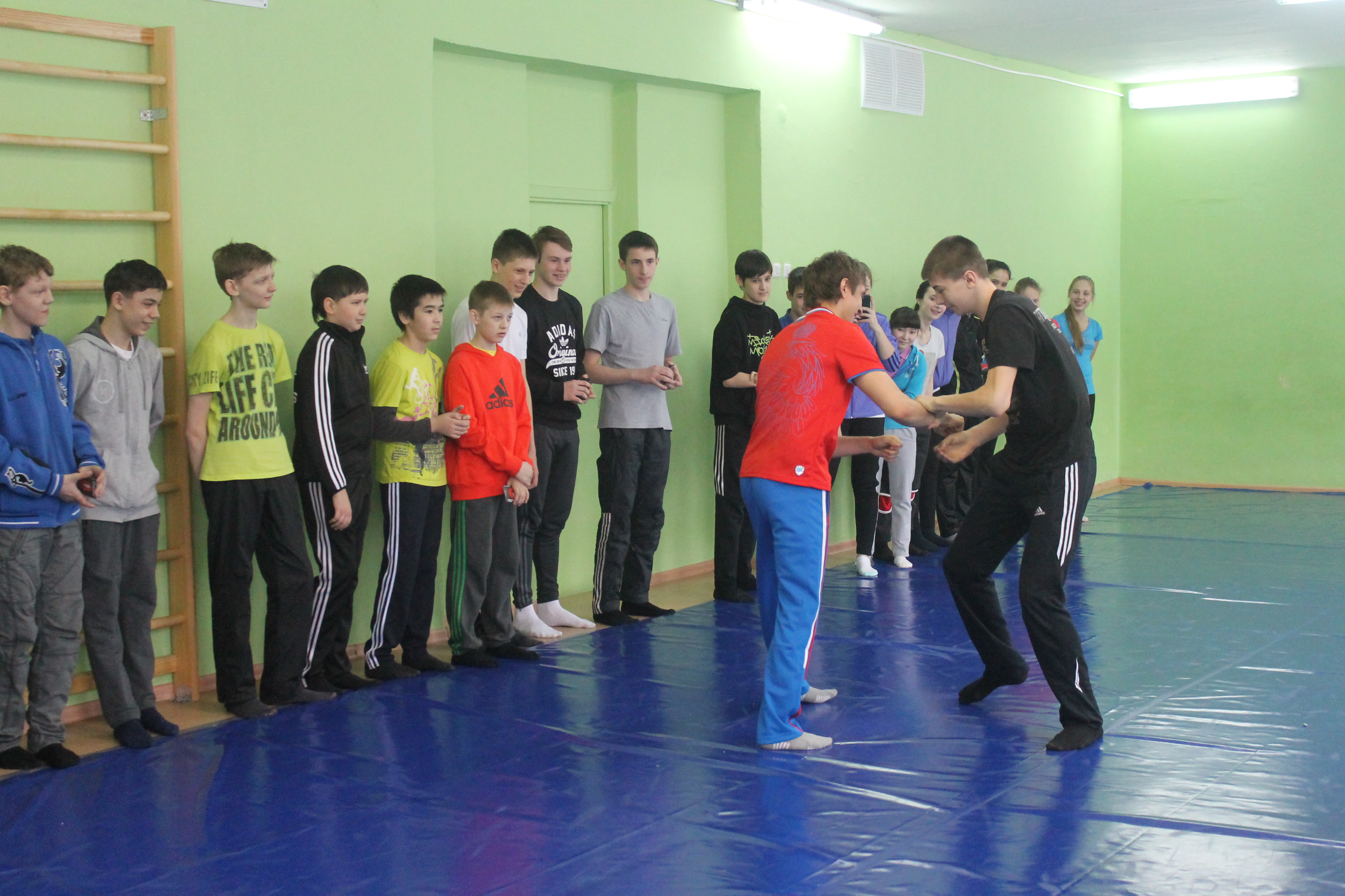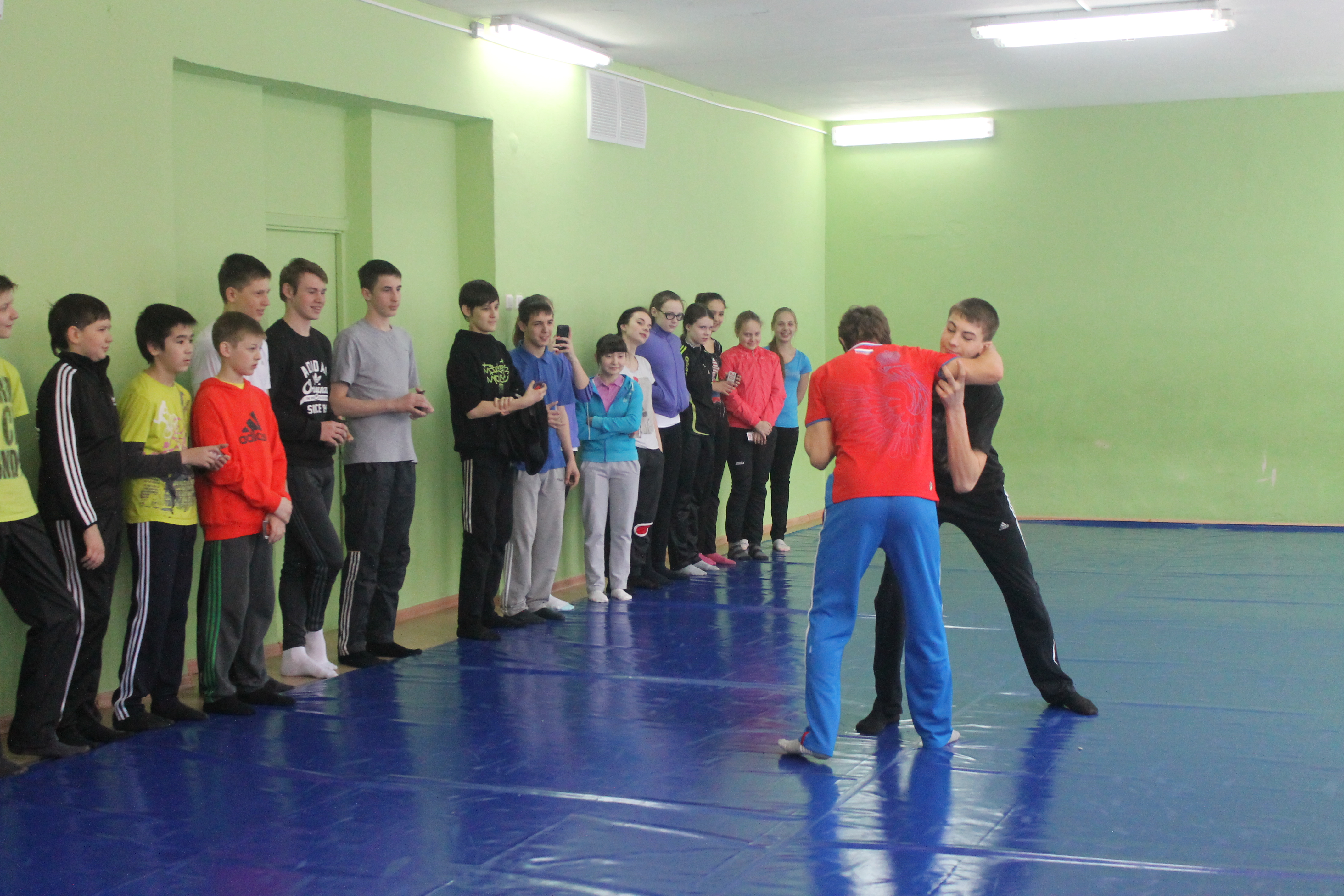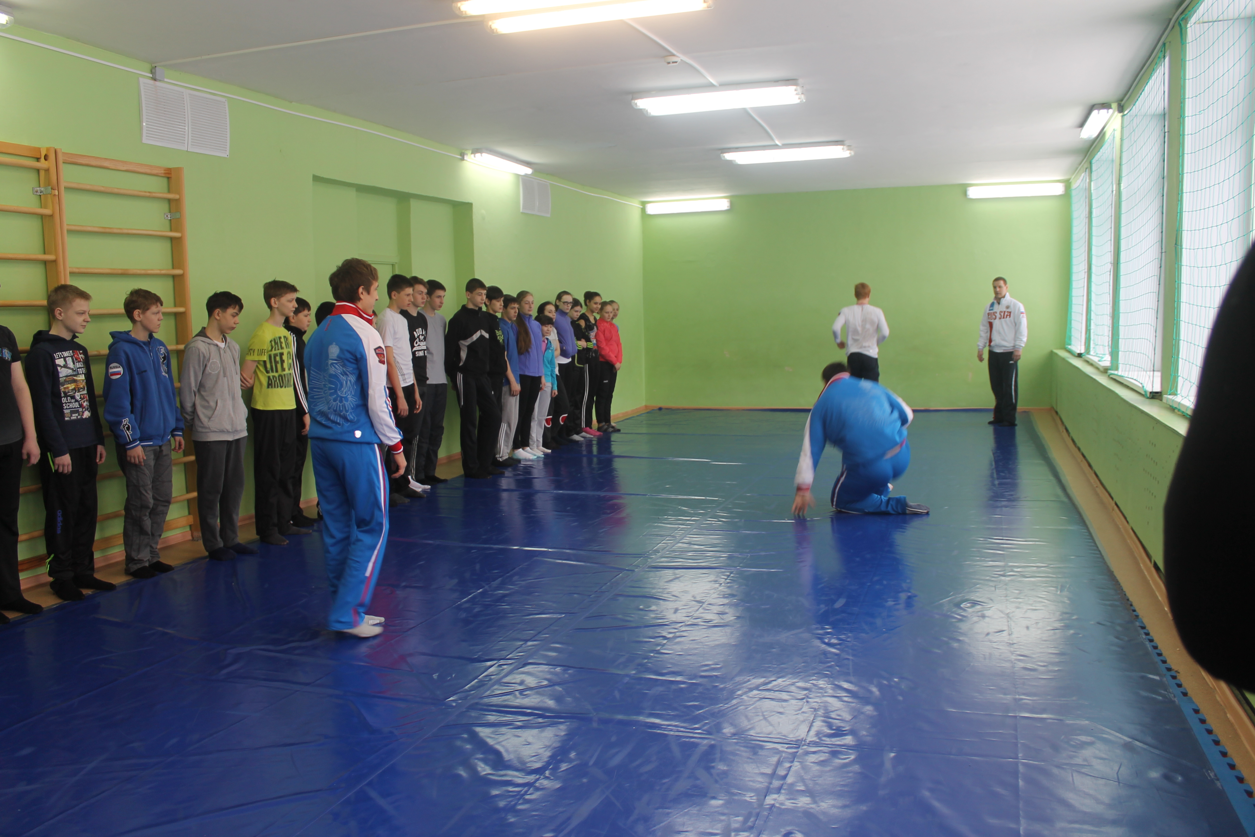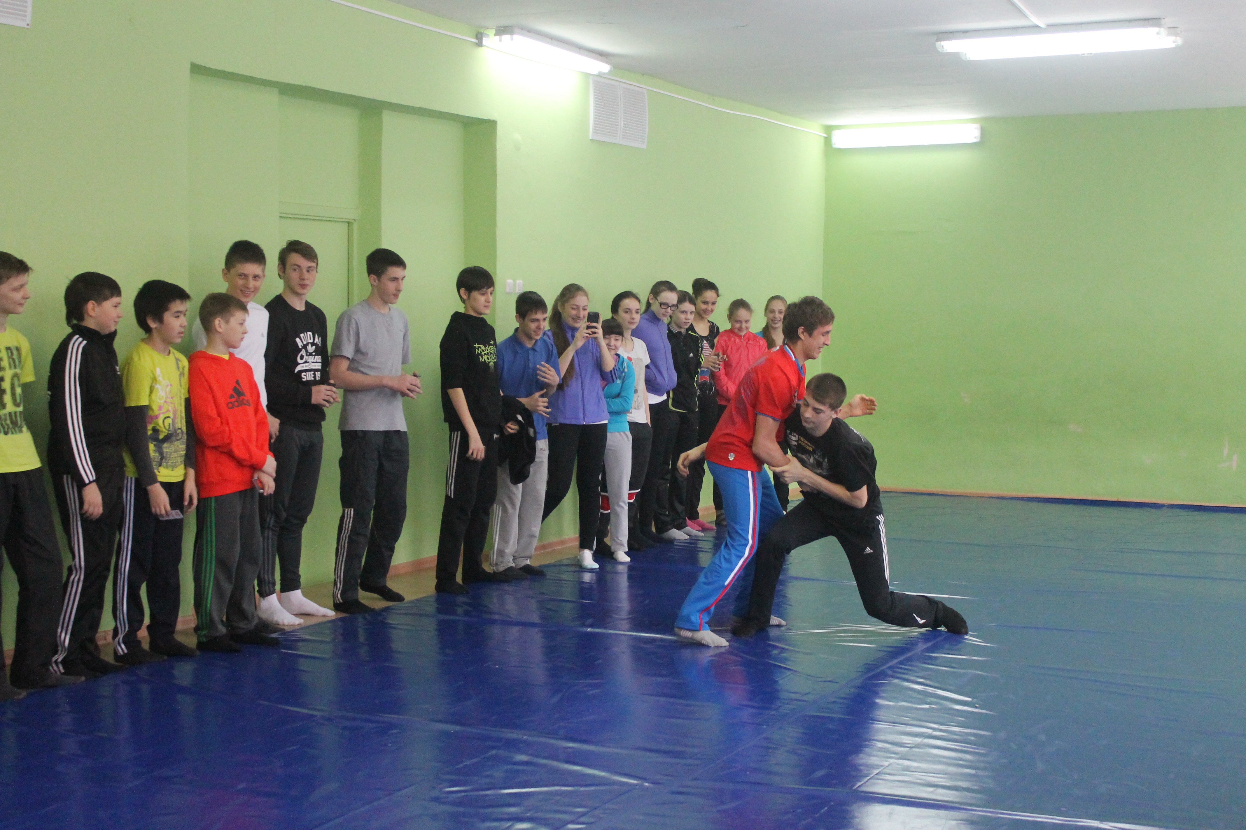 На школьном уроке ученики увидели не только как разминаются профессиональные спортсмены. В импровизированном поединке сошлись победитель первенства области по греко-римской борьбе Данил Губанов и третий призёр Всемирной гимназиады по дзюдо Александр Куликовских. Дружеская встреча завершилась вничью.