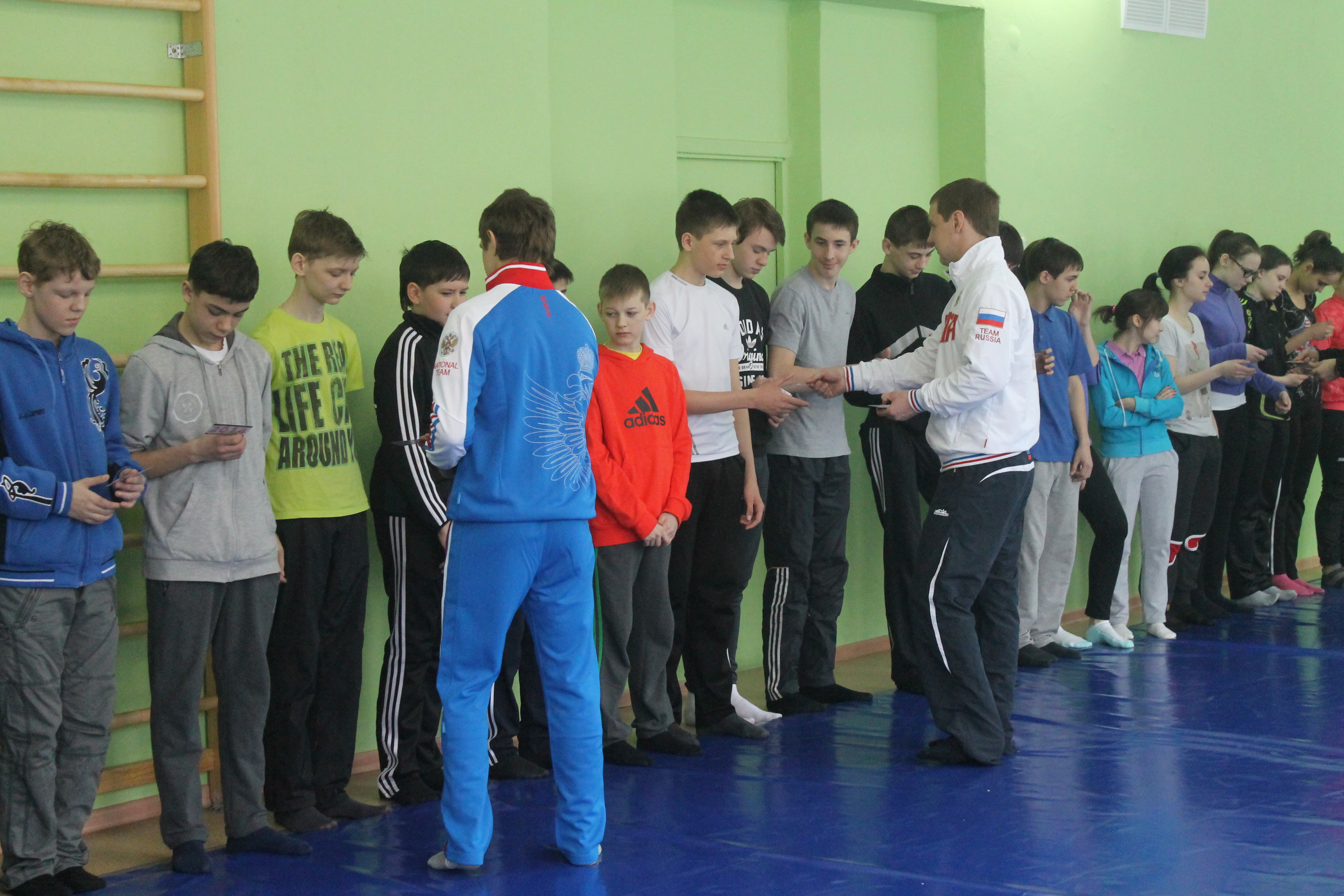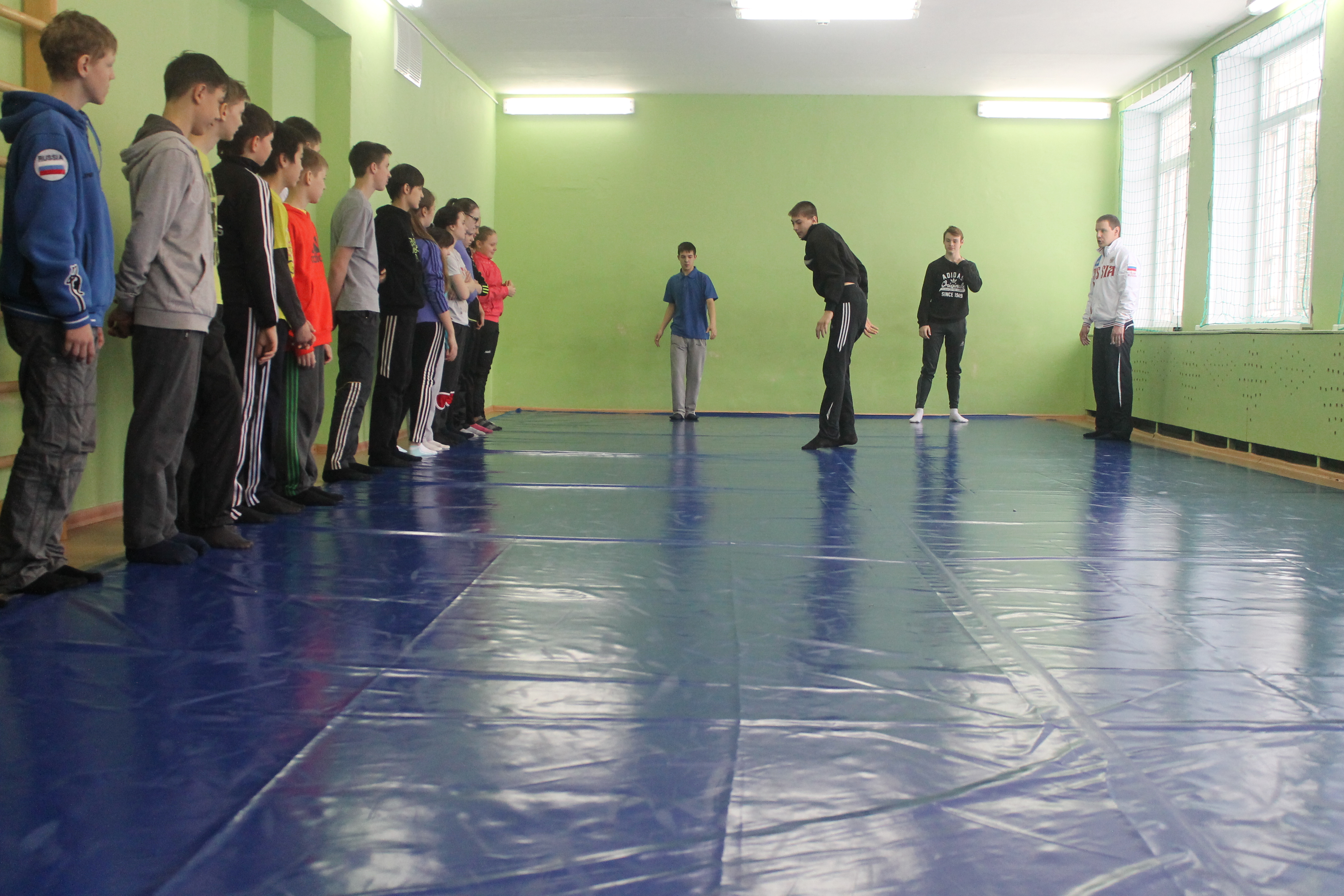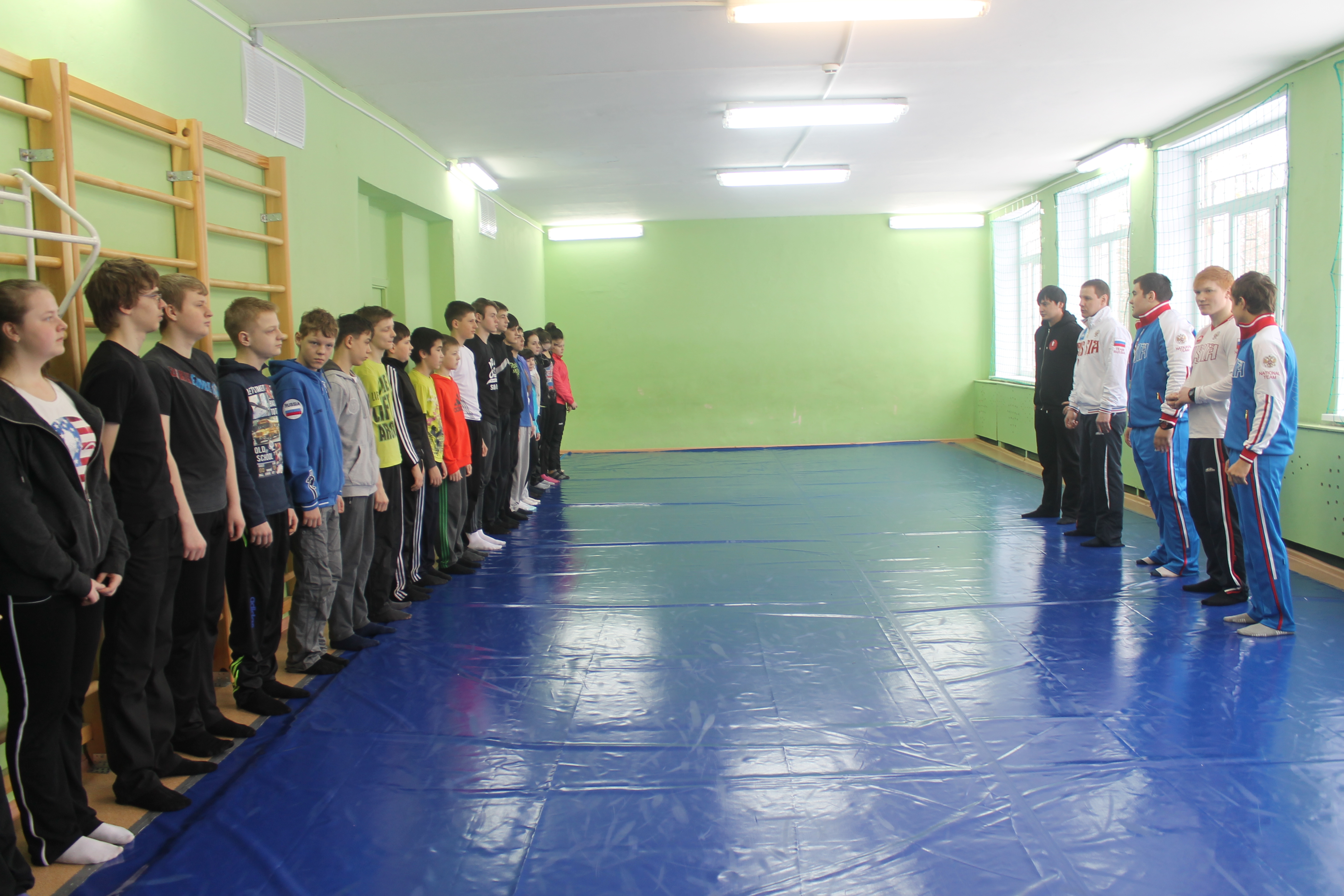 На школьном уроке ученики увидели не только как разминаются профессиональные спортсмены. В импровизированном поединке сошлись победитель первенства области по греко-римской борьбе Данил Губанов и третий призёр Всемирной гимназиады по дзюдо Александр Куликовских. Дружеская встреча завершилась вничью.