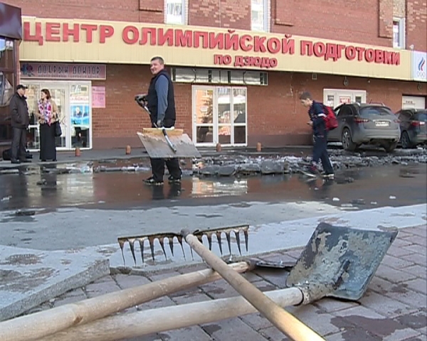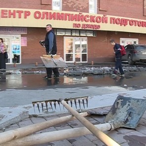 Первыми приступили к уборке прилегающей территории работники Центра олимпийской подготовки. На теневой стороне спортивного сооружения до сих пор не растаял снег. На помощь штатным сотрудникам пришли мальчишки и девчонки.