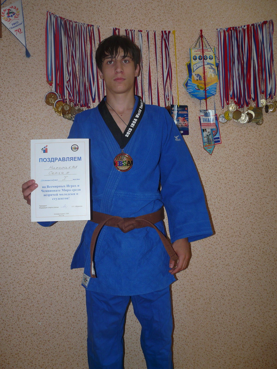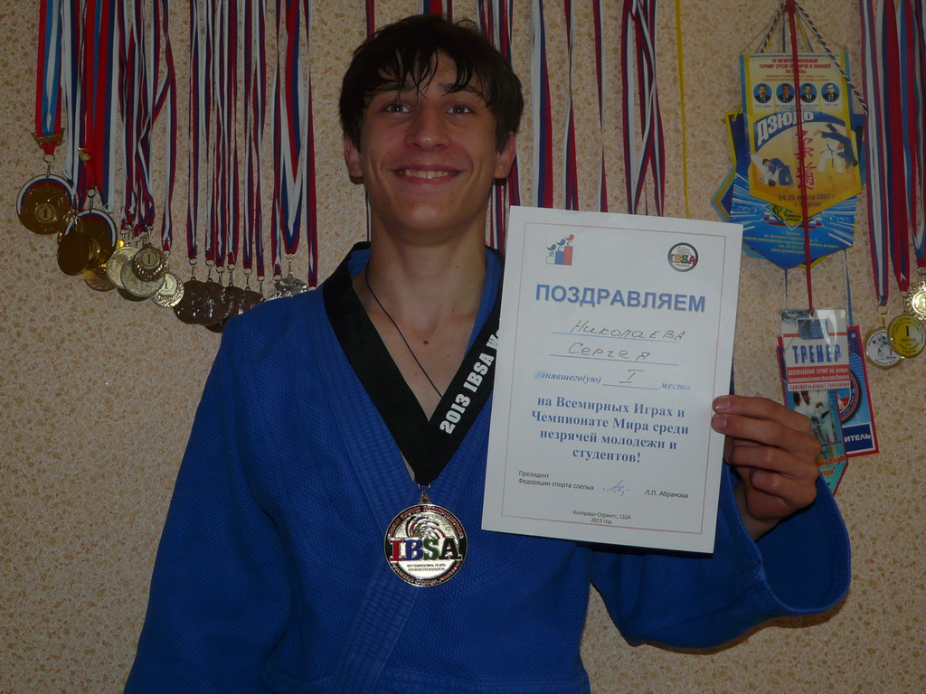 Как рассказали родители новоиспечённого победителя первенства планеты Сергей и Виктория Николаевы, их сын занимается дзюдо 7 лет, с первого класса. Он - подопечный тренеров Владимира Солдаткина и Юрия Ермакова. Учится в специальной (коррекционной по зрению) общеобразовательной школе № 127, перешёл в 9-й класс. Перед поездкой в Соединённые Штаты российская команда две недели усиленно готовилась на сборе в подмосковном Подольске. У Сергея много медалей, добытых в состязаниях среди здоровых. Спортивная мечта - успешно выступить на Паралимпиаде.