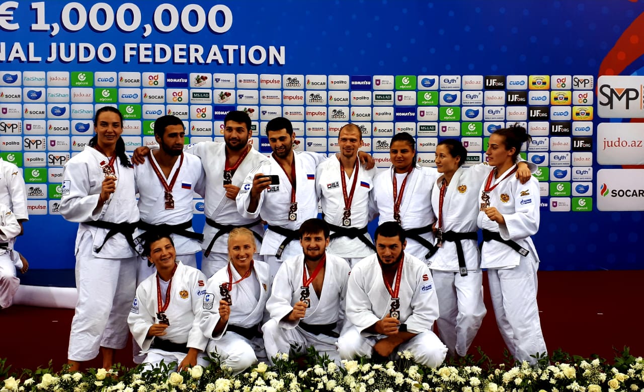 Российская сборная нанесла поражения соперникам из Казахстана со счетом 4:0, Великобритании (4:2) и Германии (4:1), однако в полуфинале уступила французской дружине (1:4). В перерыве перед решающими поединками со сборной встретился Президент России Владимир Путин, который после краткой беседы сфотографировался со спортсменами и пожелал им успеха. В итоге "малом финале" за третье место наши соотечественники превзошли хозяев татами из Азербайджана (4:1). Обладателем "бронзы" в составе российской национальной команды стал участник Олимпийских игр-2016, неоднократный призер командных чемпионатов мира и Европы Денис Ярцев (73 кг). К сожалению, вторую участницу из Челябинска Таисию Кирееву (70 кг) накануне старта командного турнира не внесли в заявку сборной России, заменив ее другой спортсменкой.