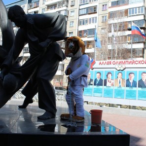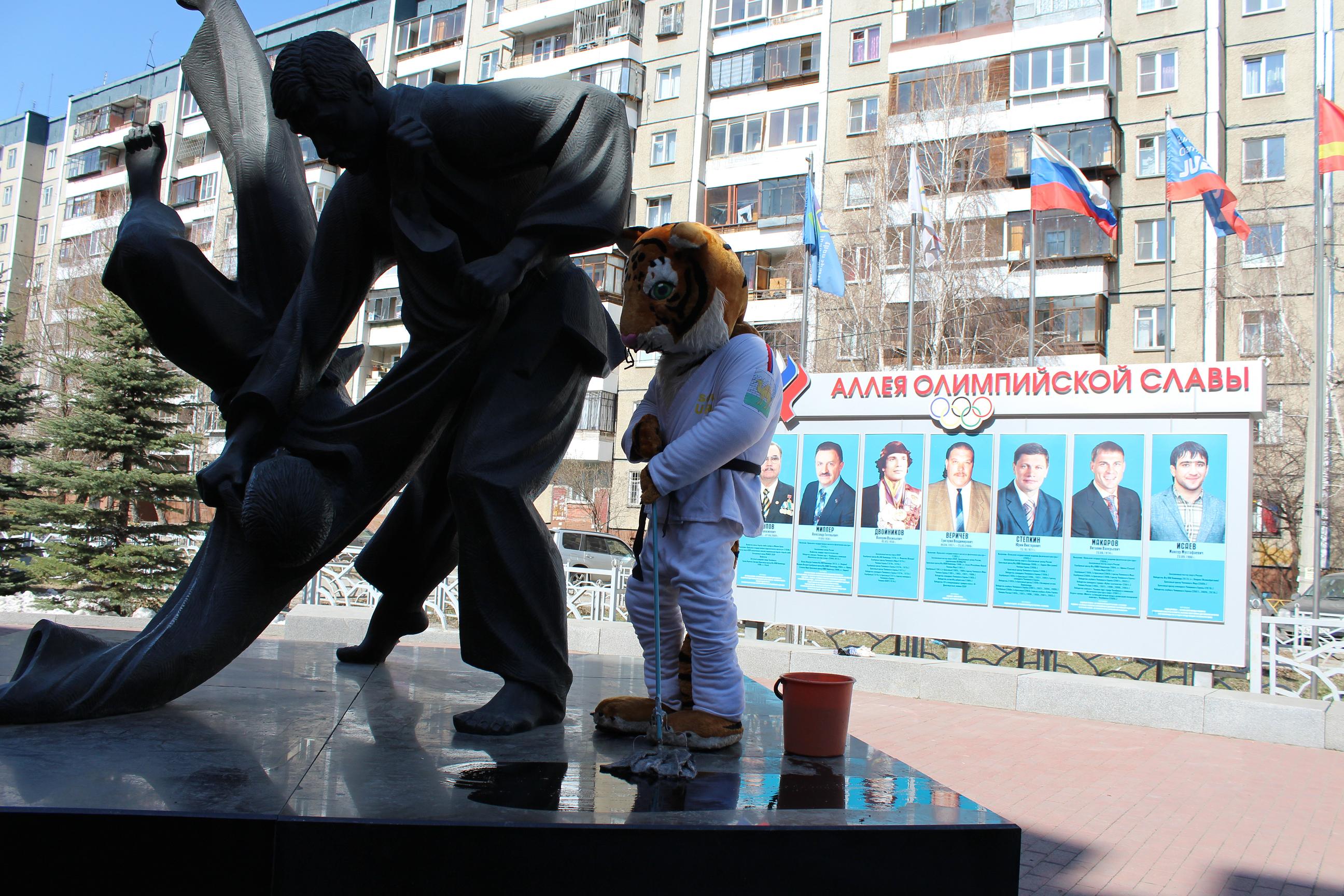 Прилегающая к центру территория не такая большая, но она облагорожена и требует постоянного ухода. Много лет около центра на ухоженных газогнах растут голубые ели, которым весенняя уборка добавит спортивного шарма. Перед центром расположен уникальный памятник «Бросок», где двое дзюдоистов сошлись в спортивном поединке. Традиционно памятник моют, наводят вокруг него порядок. В этом году талисман предстоящего чемпионата мира тигренок Жорик помог спортсменам помыть памятник. По случаю трудового праздника Жорик пришел в белом кимоно.