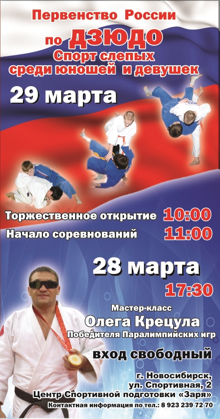 Первенство России по дзюдо (спорт слепых) проходило в Новосибирске с 28-го и 29-го марта. На татами Центра спортивной подготовки «Заря» выступило более 80-ти юношей и девушек в возрасте от 14-ти до 19-ти лет. Они приехали из Башкортостана, Дагестана, Чечни, Татарстана, Воронежской, Курганской, Пермской, Саратовской, Челябинской областей, Ханты-Мансийского автономного округа.