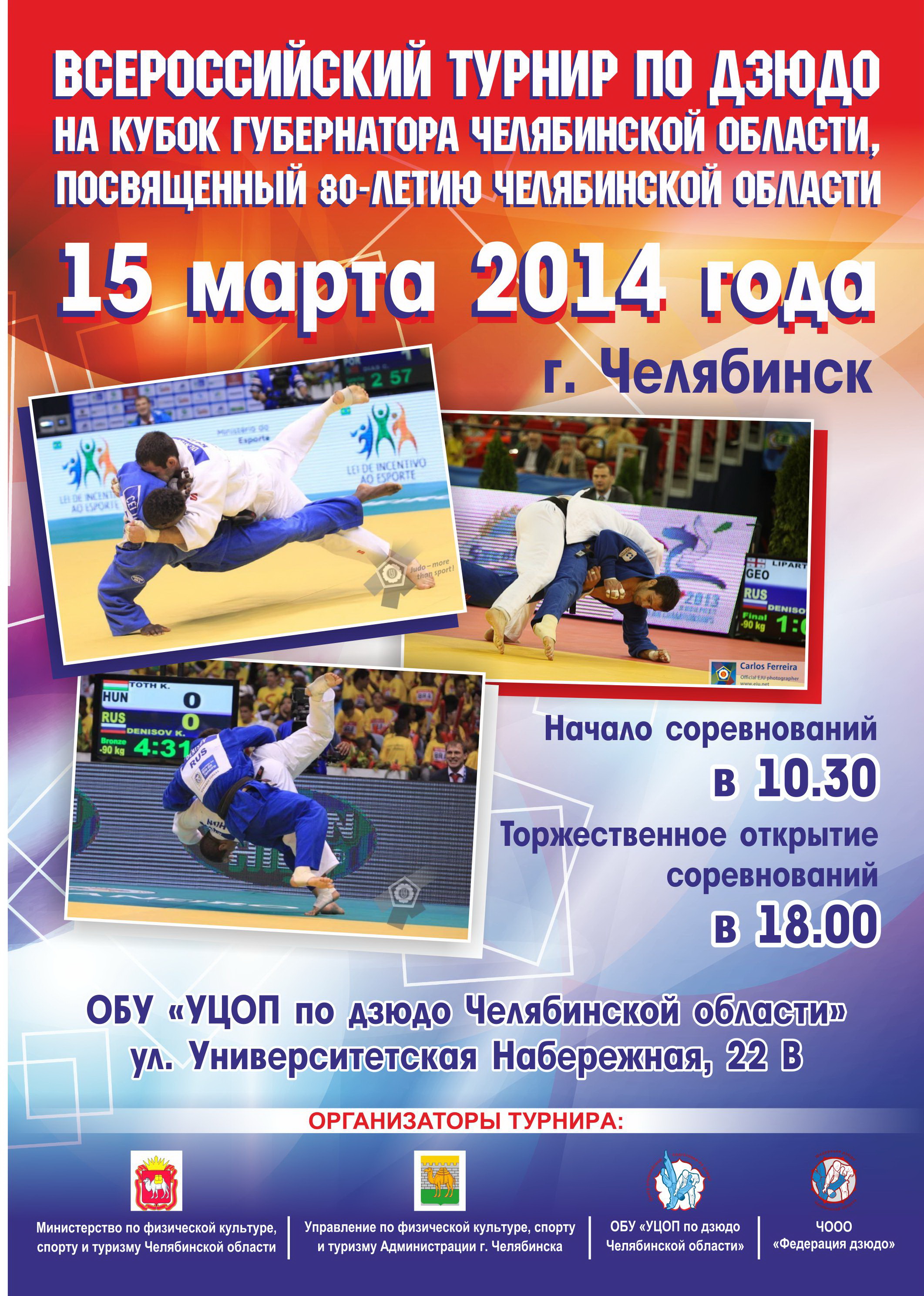 Организаторами Кубка губернатора Челябинской области по дзюдо являются региональное министерство и городское управление по физической культуре спорту и туризму, учебный Центр олимпийской подготовки и областная федерация дзюдо. Это своеобразная мини-репетиция перед грядущим грандиозным событием - чемпионатом планеты, который пройдёт на арене "Трактор" с 25-го по 31-е августа.