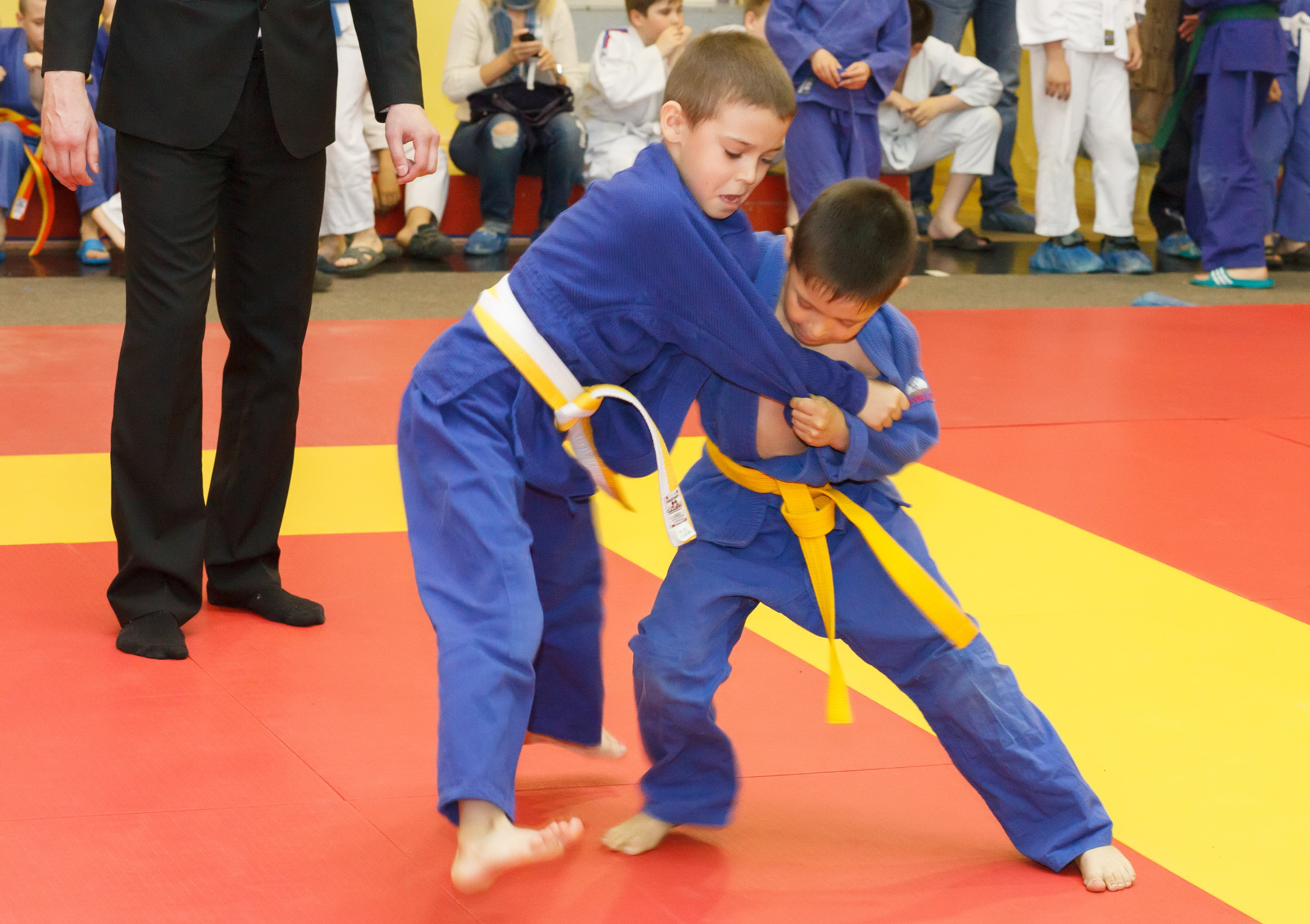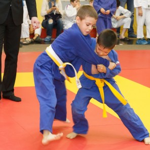 Юные дзюдоисты, среди которых были даже пятилетние, боролись по упрощенным правилам, за так называемые хвостики. Для победы им надо было дважды выхватить ленточку из-за пояса соперника.