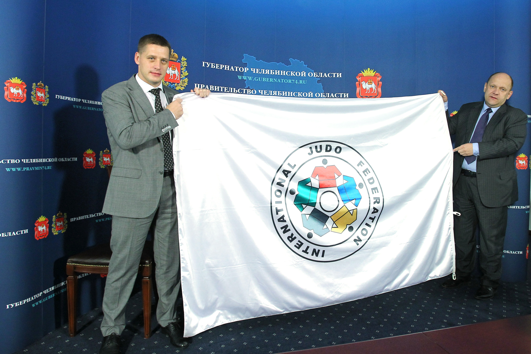 Сегодня на пресс-конференции журналистам также показали флаг Международной федерации дзюдо (IJF), который был передан представителям делегации Челябинской области на последнем мировом чемпионате в Бразилии. Он будет вывешен в арене «Трактор.