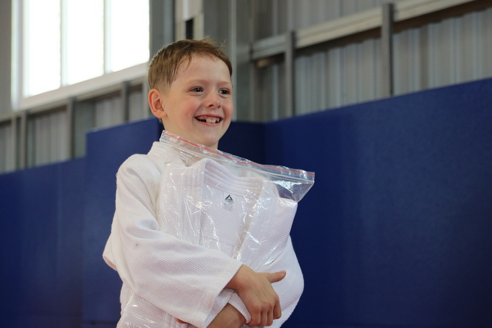 Восьмилетний Вадим Новокрещенов занимается японским видом единоборств всего месяц. За своё усердие в тренировках получил в подарок кимоно.