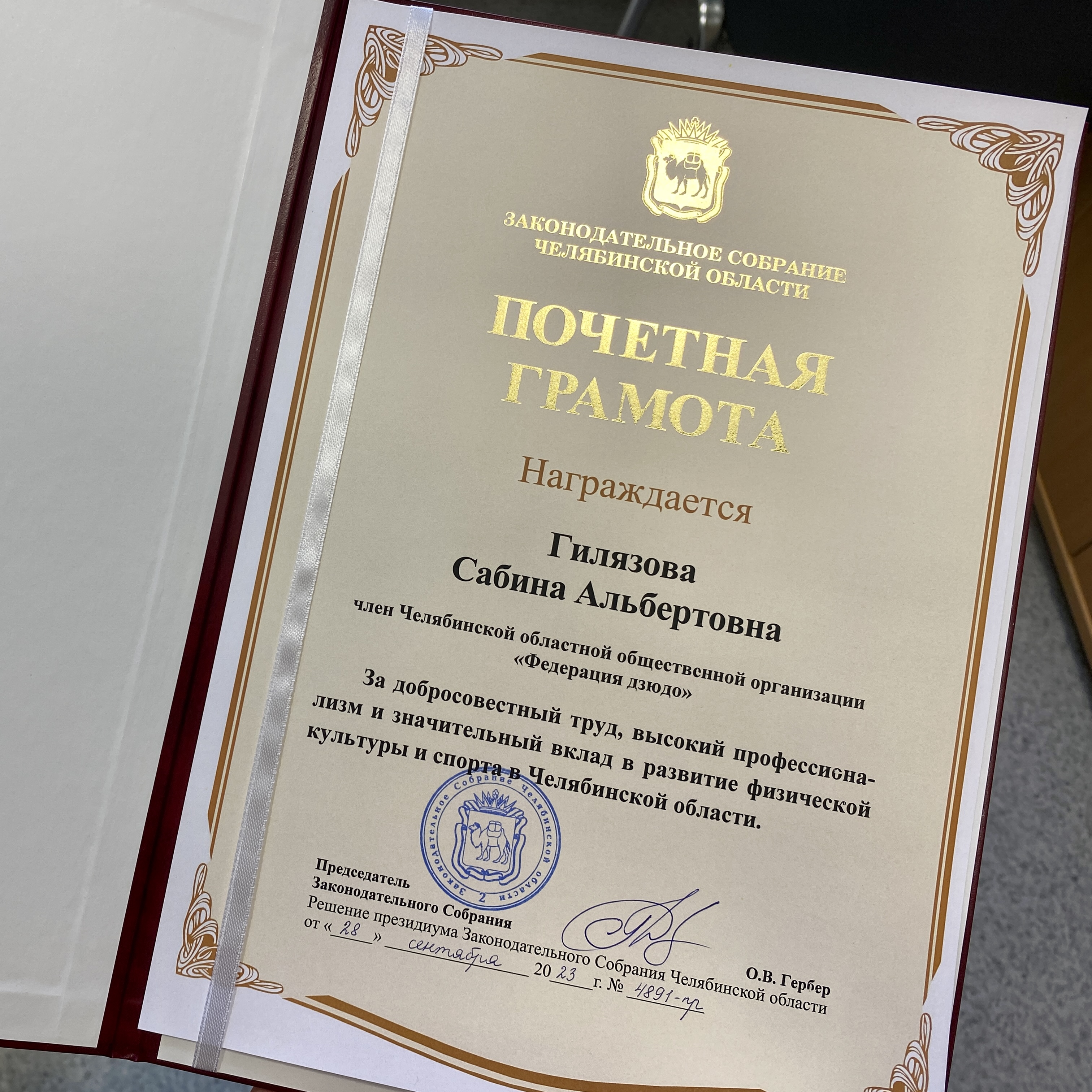 За добросовестный труд, высокий профессионализм и значительный вклад в развитие физической культуры и спорта в Челябинской области Гилязовой Сабине вручили почетную грамоту Законодательного собрания Челябинской области!